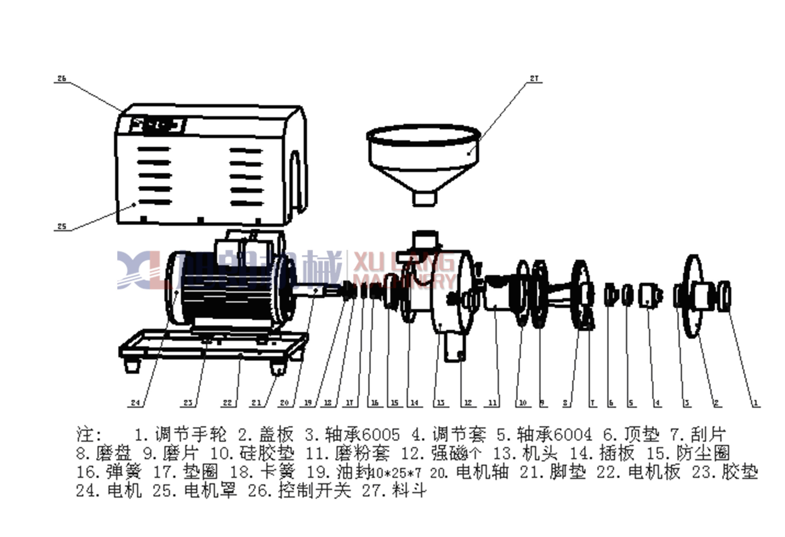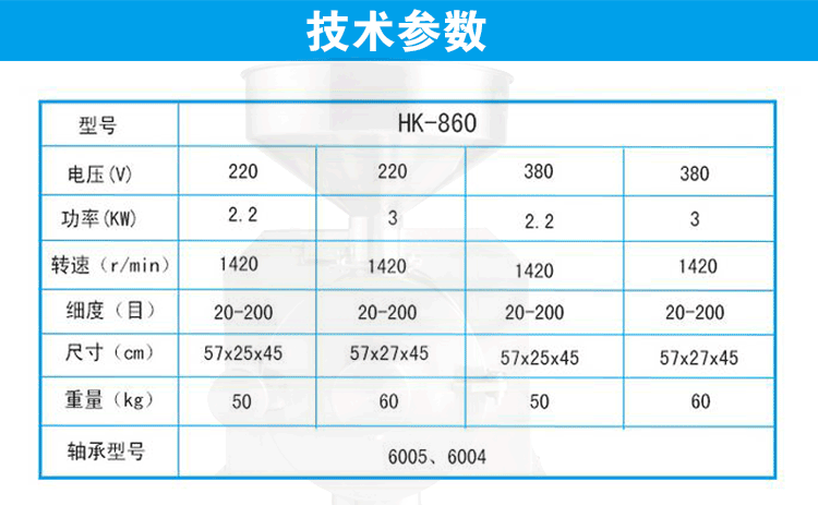 HK-860星空app官网分解示意图 ![]() ![]() ![]() ![]() 一.860星空app官网优势说明: 1、 860磨粉机不再采用低功率电机,220V有2.2和3KW两个功率,380V仅有2.4KW一个功率。新款磨粉机的电 2、 静磨片与机壁之间加装了硅胶垫,起到减震、微调磨片的效果,使两块磨片吻合更好,磨粉更细,噪音减弱。 3、 860磨粉机,电机与电机固定板之间,电机固定板底下,均加装橡胶垫,进一步加强减震和降噪效果。 4、 860磨粉机门盖和腔体之间,采用紧密加工方式,以台阶位配合方式,确保不漏粉,确保调节器顶垫和磨 5、 860磨粉机的粉碎腔坡度(即静磨片安装位),采用科学设计,进一步保证了磨粉的细腻度,达到进口即 6、 860磨粉机的调节器槽牙,采用高级机械加工中心,确保加工精密度,达到了方便调节、配合紧密、噪音 7、 磨粉机的磨盘装上磨片和刮片后,经过电脑动平衡检测,进一步保证了同心度和重心的平衡度, 8、860磨粉机的底座和电机之间没有轴承,便于客户拆装,又减少了故障发生,提升了机器品质。 9、磨粉机达到了出料顺畅、磨粉非常细腻、噪音和震动比老款小很多的效果。 860磨粉机,每台均配送价值200元的大礼包,含2副磨片(机器上本身自带1副)、不锈钢下料棒1根、 磨粉机的电机启动运转时,连接轴以及套在连接轴上的磨盘一起运转。待磨物料从料斗进入磨粉套,磨盘 三.技术参数 四.操作与调整 1、磨粉机应放置在水平、固定、结实的水平桌面或者台面上,厚实木更佳。 2、由于磨粉机电机在工作后会不断产生热量,所以磨粉机应放在宽敞通风处,有利于散热降温。如果 3、将机盖打开,再将磨盘固定在连接轴上,再用两个大拇指按压在磨盘上,如果磨盘能够自由伸缩,说 4、启动电源,运转1分钟左右,将物料放进料斗,将调节器拧至适当位置,打开下料挡板,使物料缓慢地 5、 磨粉的粗细取决于两块磨片之间的间隙,而磨片的间隙靠调节器进行控制,根据机盖上的粗细指示, 6、调节器的调节范围和力度该如何控制,可以通过耳朵听磨片摩擦产生的声音以及电机运转的声音来决 7、单独磨含油量特别高的物料如芝麻、核桃、花生等,因为这类物料的含油量特别高,只能磨成粗粉, 8、动磨片和静磨片的装卸:装在磨盘上的为动磨片,装在粉碎腔的为静磨片。将固定磨片的3枚螺丝取下 五.注意事项 1、使用前详细阅读使用说明书,严格按照操作规范操作机器,每次开机前,应检查静磨片、动磨片、刮片 2、磨粉机一定要外接断路保护(过载保护)装置,以保护电机和人身安全。 3、加工五谷杂粮、中药材等,应先烘干或烘熟,清除石块、金属等杂物。物料受潮变软或者发粘后,应该 4、每次使用机器结束后,应将机器内部清理干净,不得用水直接冲洗,并通风晾干。 5、严格按照规定接地线,电机应以逆时针方向运转,机器正常运转无异常、无异动、无异响时,方可操作 6、磨粉机需固定在牢固稳定水平的桌面和柜台上,才能最大地减轻震动和噪音。 7、在加工过程中,如因停电等原因突然停机,必须先关闭电源开关,再清除粉碎腔内的残余物料后,才能再 8、如发现机器零件有严重磨损或损坏时应及时进行修理或更换。 9、机器启动后,应待运转正常时才能放料加工,注意控制进料量,防止电机超载闷机。 10、机器较长时间不用时,应切断外电源,机器勿到置,要平放,上面不要放重物。 11、本机保修一年,人为使用不当引起的损坏,以及正常磨损,不属保修范围。需返回销售单位或者厂家进行 六.操作方法和技巧 (一)、操作方法 1、机器每天使用前必须检查机器是否运转正常、静磨片和动磨片的螺丝是否有松动,并加以拧紧。 2、磨干性材料 磨干性材料是需要磨两次,第一次粗磨,第二次细磨。 第一次粗磨时,调节调节螺丝至磨片有轻微的吱吱摩擦声音,再往粗回调节到刚刚没有摩擦声,然后打 3、磨干性加油性混合材料 方法一 磨干性加油性混合材料时需要磨两次,第一次粗磨,第二次细磨。 第一次粗磨时,调节调节螺丝至磨片有轻微的吱吱摩擦声音,再往粗回调节调节螺丝一圈,然后完全打开 第二次细磨时,调节调节螺丝至磨片有轻微的吱吱摩擦声音再打开下料口插版1/4-1/3即可。 方法二 第一次将干性材料细磨(与磨干性材料操作方法一样)。 第二次将已经磨好的干性材料与油性材料混合均匀,在调节调节螺丝至磨片有轻微的吱吱摩擦声音,然后 4、磨含糖份高的材料 磨含糖份高的材料时,(比如红枣、金桔片、枸杞等等)糖份高的材料需烘焙干,去水份,或速冻两个小时 5、磨含糖份高的混合材料,操作方法和磨干性加油性混合材料操作方法相同。 (二)、更换磨片 1、拆下旧磨片(磨片有正反面,静磨片和动磨片可以调换使用)。 2、安装好磨片,调整磨片内孔与粉碎套或动磨盘安装位置的缝隙均匀再拧紧螺丝。 3、调节磨片的平整:开启机器,调节调节螺丝至磨片发出非常刺耳的声音,运行20-30秒钟左右,停机打开 (三)、磨合磨片 1、取2-3斤大米放入漏斗,启动机器调节调节螺丝至磨片刚刚有轻微的吱吱摩擦声音,再往细调节调节螺丝 七.常见故障及排除方法 故障现象 故障原因 排除方法 电机不能启动或启动困难 导线直径小,电压过低电容损坏 更换适当导线待恢复电压后再启动 电机无力 温度台高 电机绕组短路或电机轴承损坏,长期超负荷运转 检修电机,更换电机轴承,按额定负荷工作或暂停 机身发生 强烈震动 其它零件重量不